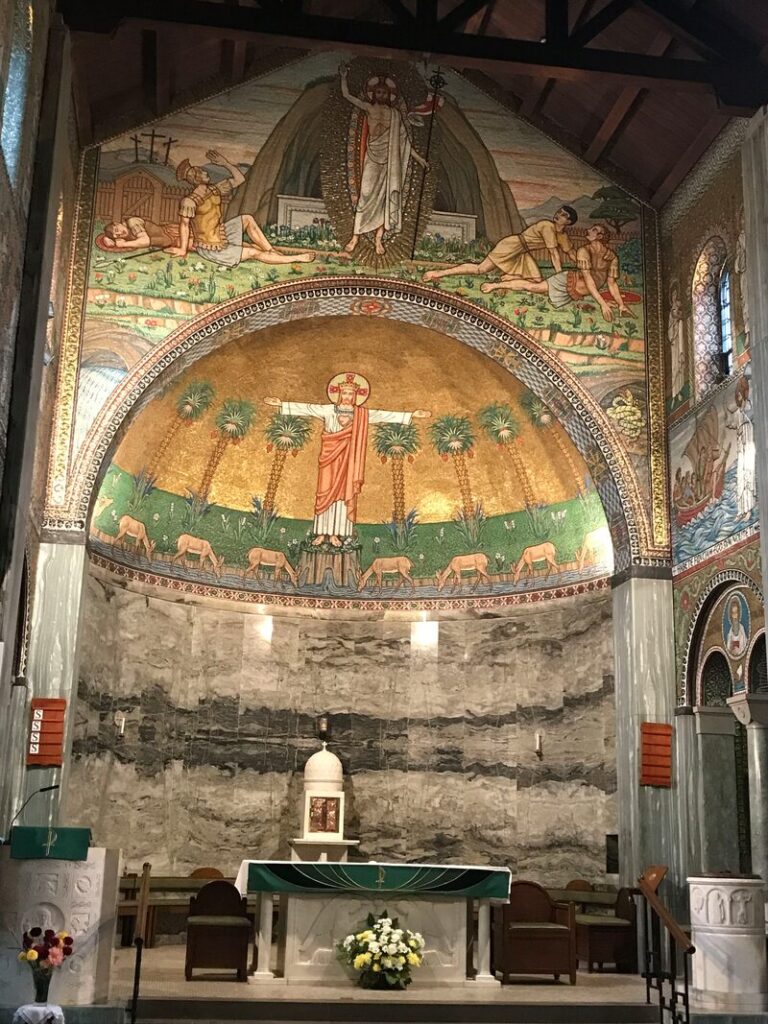 David, our guide, captivated us for over an hour and a half with details of the building and explanations of the images made from over 8 tons of Venetian glass ‘tessarea’ pieces are considered to be among the finest in England. They were designed by Gabriel Pippet and carried out by the mosaicists Maurice Josey and Fred Oates in the 1920s. Pippet was a native of Solihull and died here in 1962 aged 82 years. He was a prolific illustrator and wood carver but there appear to be few if any photos of him. However, David did point out the stone frieze of the Annunciation over the main doorway featuring of course the angel Gabriel but with a little bird sitting behind him – obviously a Pippet, so he had in fact signed his own masterwork! This building is spectacular and well worth a visit.