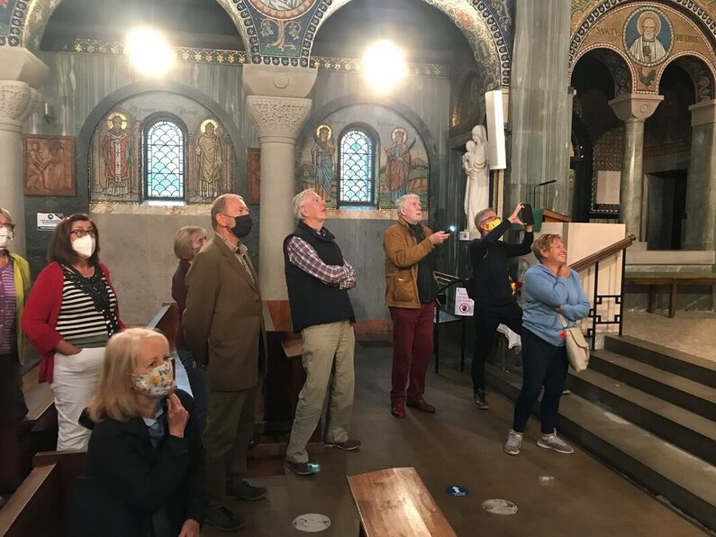 Sixteen members of ssu3a celebrated the end of lockdown restrictions with a day trip to the ancient salt town of Droitwich. This trip had been planned before lockdown and rearranged several times during 2020 in the hope of being able to go ahead. Organisers Christine and myself were hugely relieved when, at last, it happened and everyone at the end of the day said how much they had enjoyed it. Christine had arranged a guided tour of The Sacred Heart Church which despite its unassuming outside appearance, once inside, was a real gem. The walls are covered with the most beautiful religious mosaics rivalled only by those found in Venice or Westminster Cathedral.